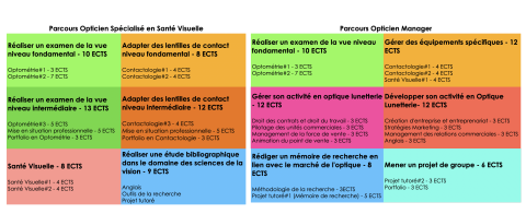 La licence professionnelle d’Optique propose deux parcours : Opticien spécialisé en Santé Visuelle et Opticien Manager. Ces deux parcours partagent un tronc commun d’environ 50% du volume horaire, qui vise à apporter des compétences en examen de la vue, en contactologie et en santé visuelle. Le parcours Opticien spécialisé en Santé Visuelle approfondit ces compétences, tandis que le parcours Opticien Manager se concentre sur le développement de compétences en gestion et en développement d’entreprise dans le secteur de l’optique lunetterie. Le parcours Opticien spécialisé en Santé Visuelle peut être suivi en alternance ou en temps plein, tandis que le second est exclusivement proposé en alternance.