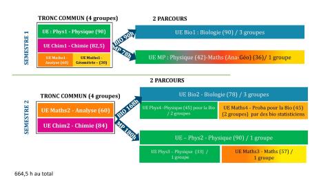 Les enseignements sont dispensés sous forme de cours et de travaux dirigés en groupes de 60 ou 30 étudiants respectivement. Quelques travaux pratiques permettent de compléter les notions enseignées. La présence à tous les enseignements est obligatoire et la quantité de travail à fournir est très importante : en moyenne, 24 heures hebdomadaires d’enseignement en présentiel auxquelles il faut ajouter l’équivalent en travail personnel.Les étudiants sont évalués par un contrôle continu, ce sont les résultats obtenus au cours des deux semestres qui sont pris en compte pour la délivrance du Diplôme Universitaire.
